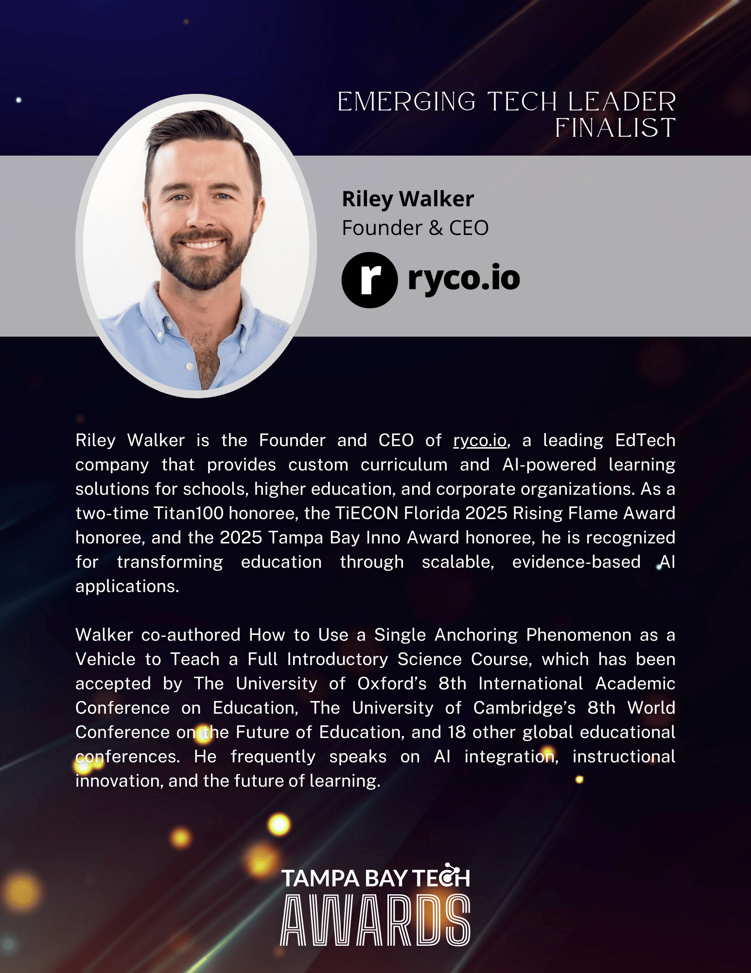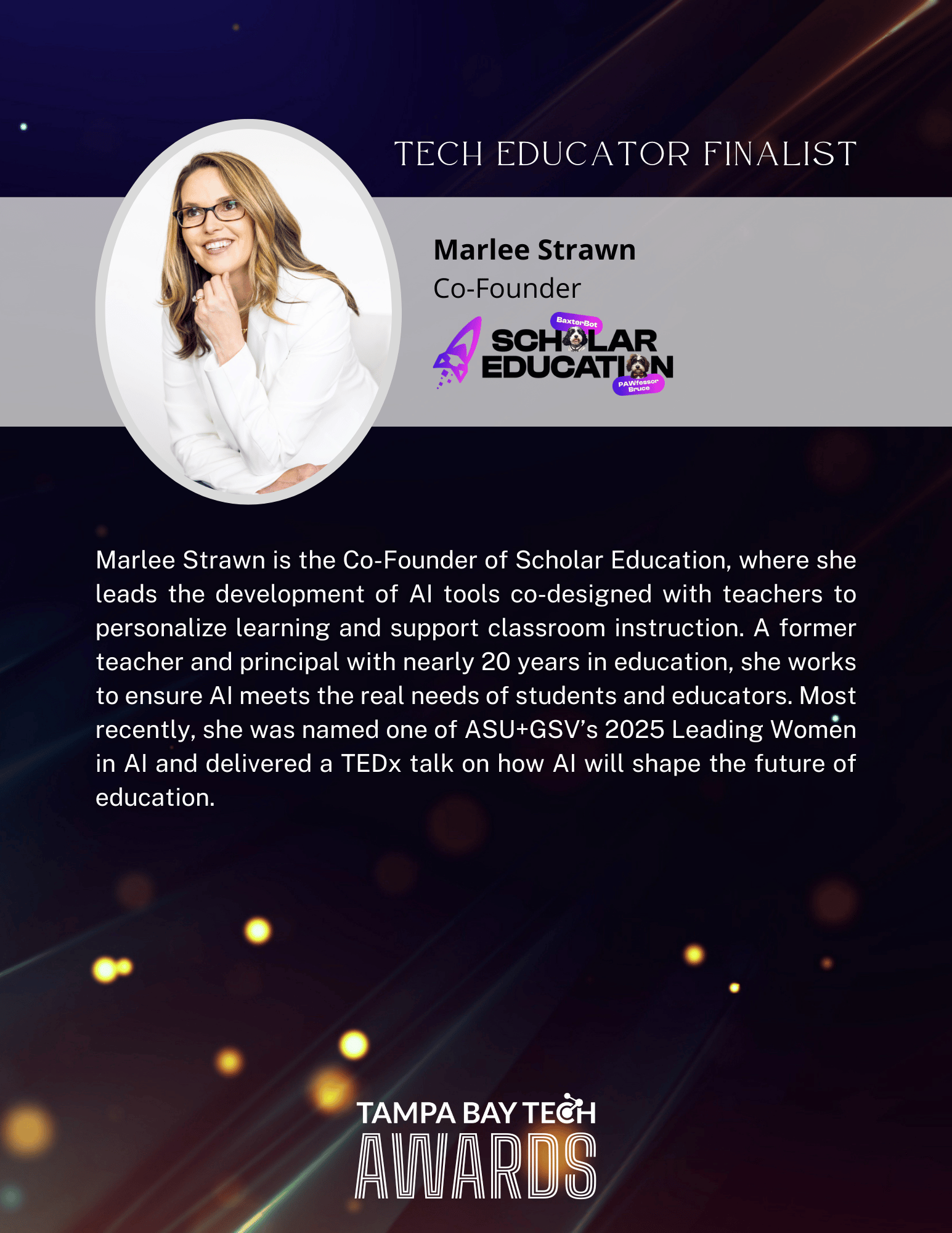The Tech Educator of the Year Award recognizes an individual in an educational role that made asignificant impact on student interest in pursuing a technology-centric career in the region. Additionally, the educator has delivered positive outcomes for technology students in the Tampa Bay region. This award honors the commitment to delivering a quality technology-centric curriculum that is appreciated and practiced by the student population.